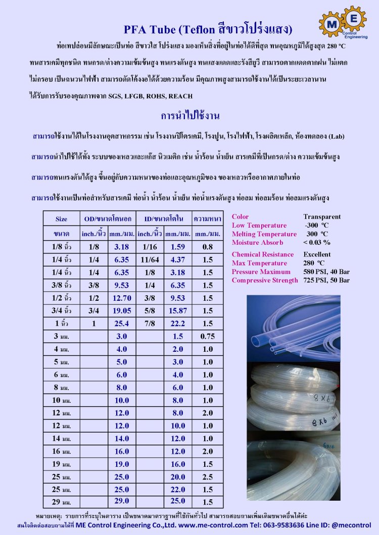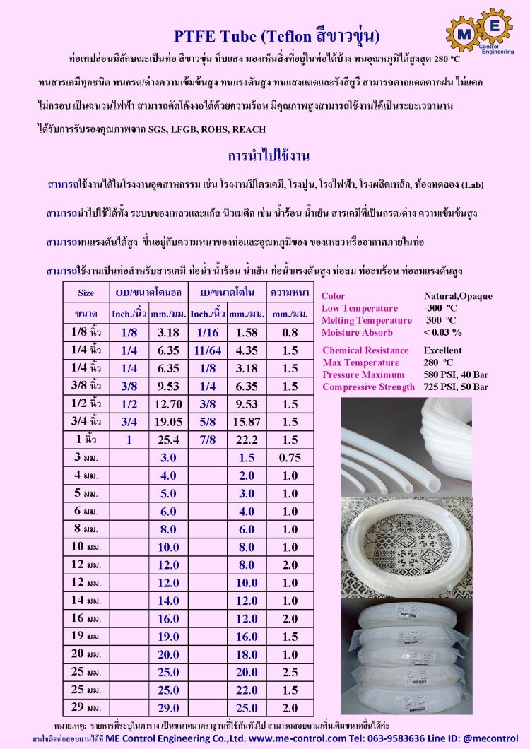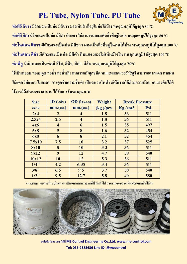 บริษัท เอ็มอี คอนโทรล เอ็นจิเนียริ่ง จำกัด ดำเนินธุรกิจ โดยวิศวกรที่มีประสบการณ์และความเชี่ยวชาญ เป็นผู้นำเข้า ผลิต และจัดจำหน่าย ท่อเทปล่อน (Teflon Tube: PTFE, PFA) ท่อพี (PE Tube) ท่อไนล่อน (Nylon Tube) ท่อพียู (PU Tube) คุณภาพดี ราคาถูก